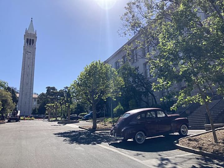 Period car at UC Berkeley campus for the filming of the 2022 movie Oppenheimer | Heartk, CC0, via Wikimedia Commons