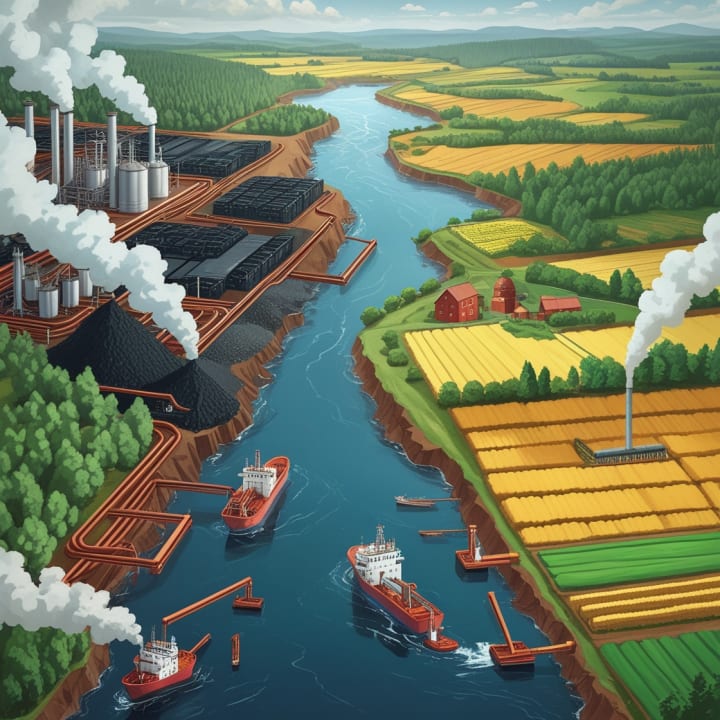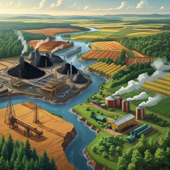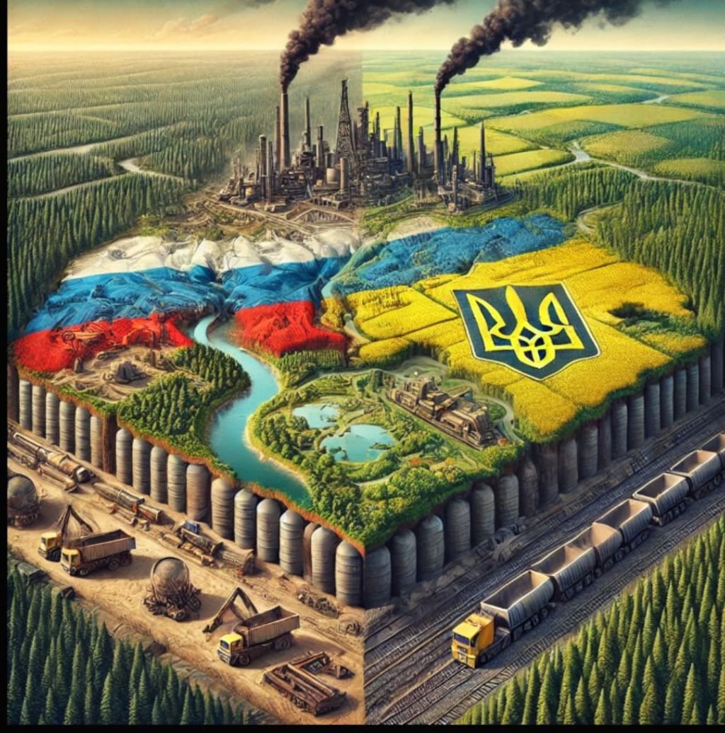This illustration visually compares the vast natural resources of Russia and Ukraine. Russia is represented with expansive oil fields, deep coal mines, and large forests, emphasizing its dominance in energy and mineral wealth. Meanwhile, Ukraine is portrayed with fertile farmland, rich iron ore mines, and abundant agricultural production, highlighting its strength in food and industrial minerals. The image underscores the economic importance of these resources for both nations.