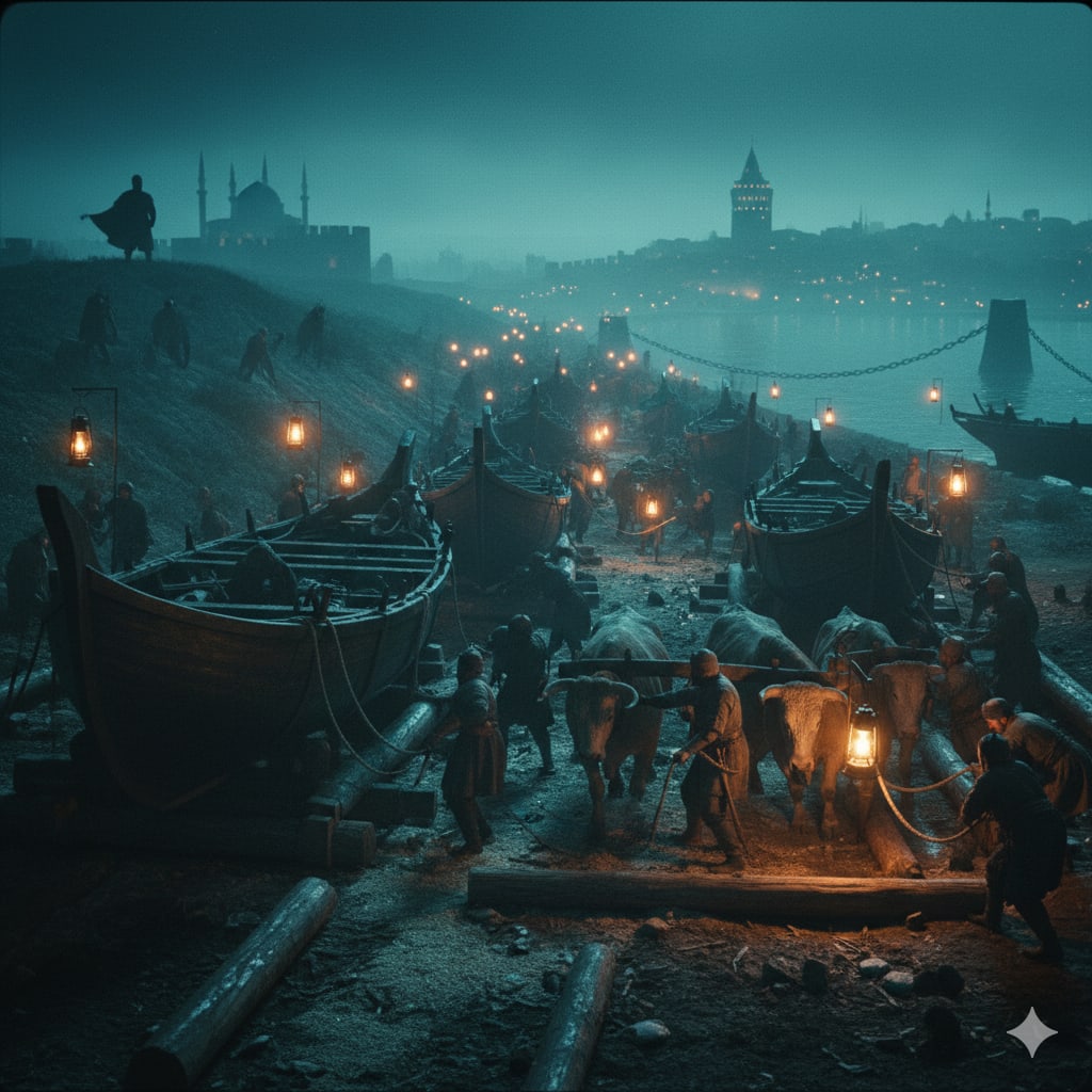 Torches bloomed like fireflies. War drums pulsed a hypnotic rhythm. Baltaoğlu, stripped to the waist, bellowed orders: "Heave, brothers! For the Sultan! For Islam!" Oxen lowed in harness; Janissaries chanted prayers. The first ship, the Iskele, a 200-foot galley with 200 oarsmen, creaked onto its cradle. Ropes snapped taut. "Pull!" A thousand backs strained. Mud sucked at wheels; thorns tore flesh. One sailor collapsed, ribs cracking under the strain—dragged aside without pause. By midnight, the Iskele crested the hill, sliding into the Golden Horn's northern shore like a leviathan reborn.