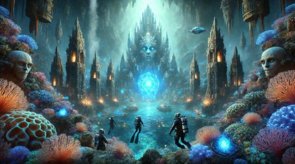 The team eventually discovers a shimmering dome of energy protecting the sunken ruins of Thalassia. Upon entering, they are greeted by the remnants of the once-great city: towering coral-encrusted spires, glowing murals of an ancient aquatic race, and the Heart of Thalassia itself. However, their presence awakens the long-dormant guardians of the gem—colossal sea serpents and sentient whirlpools.