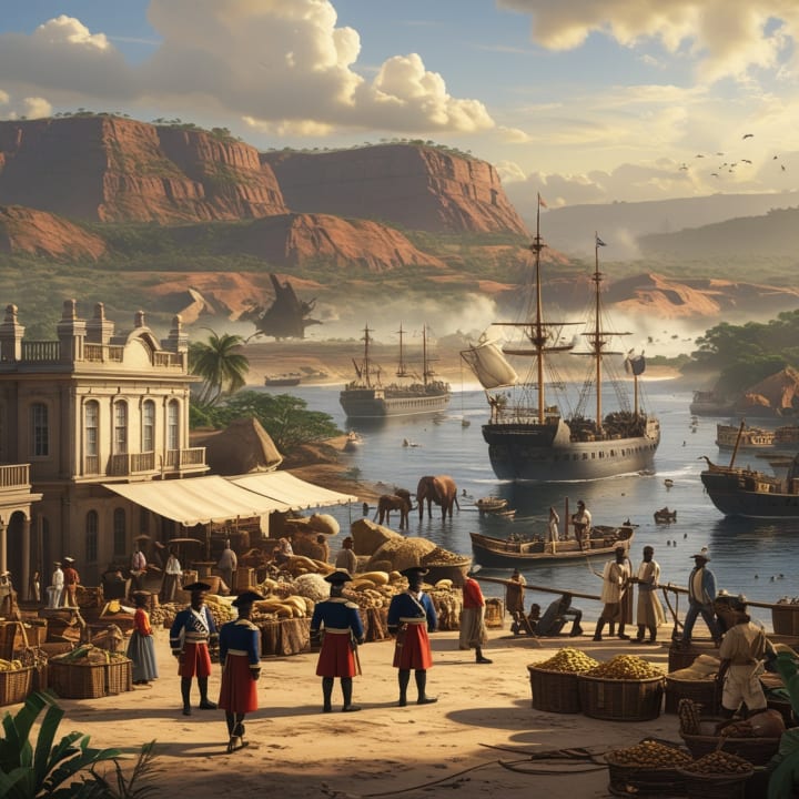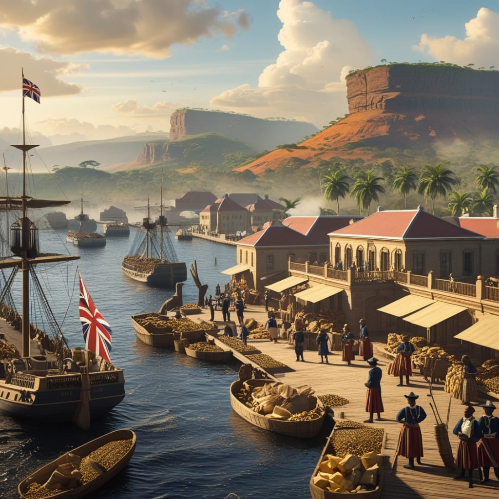 This image represents the British Empire's vast influence in Africa during its colonial peak. It depicts a thriving trade hub where goods like gold, ivory, and spices were exchanged, reflecting the economic exploitation that fueled Britain's rise. The scene also hints at the continent’s vast natural wealth and the lasting effects of imperial control, showcasing both power and resistance.