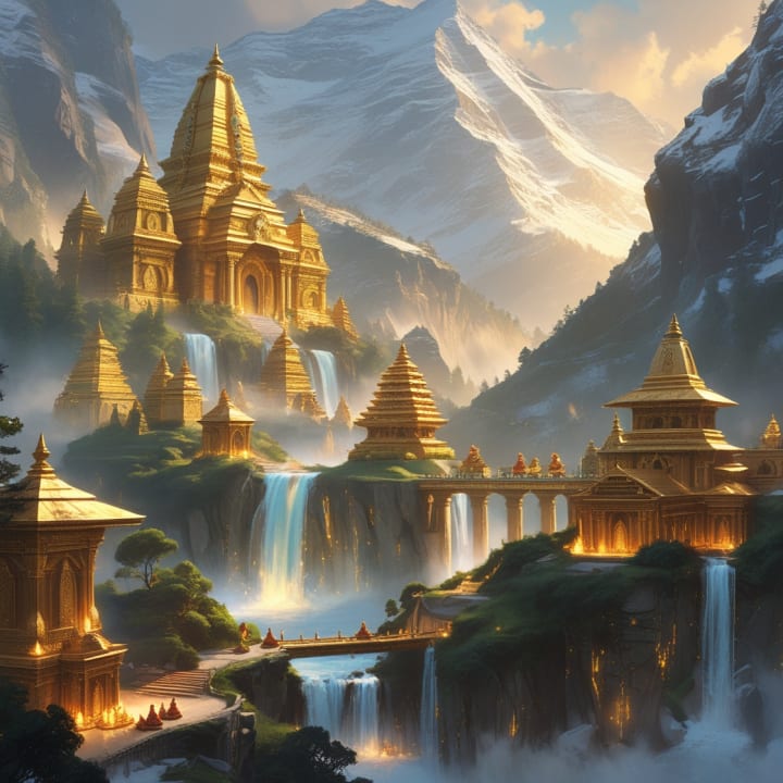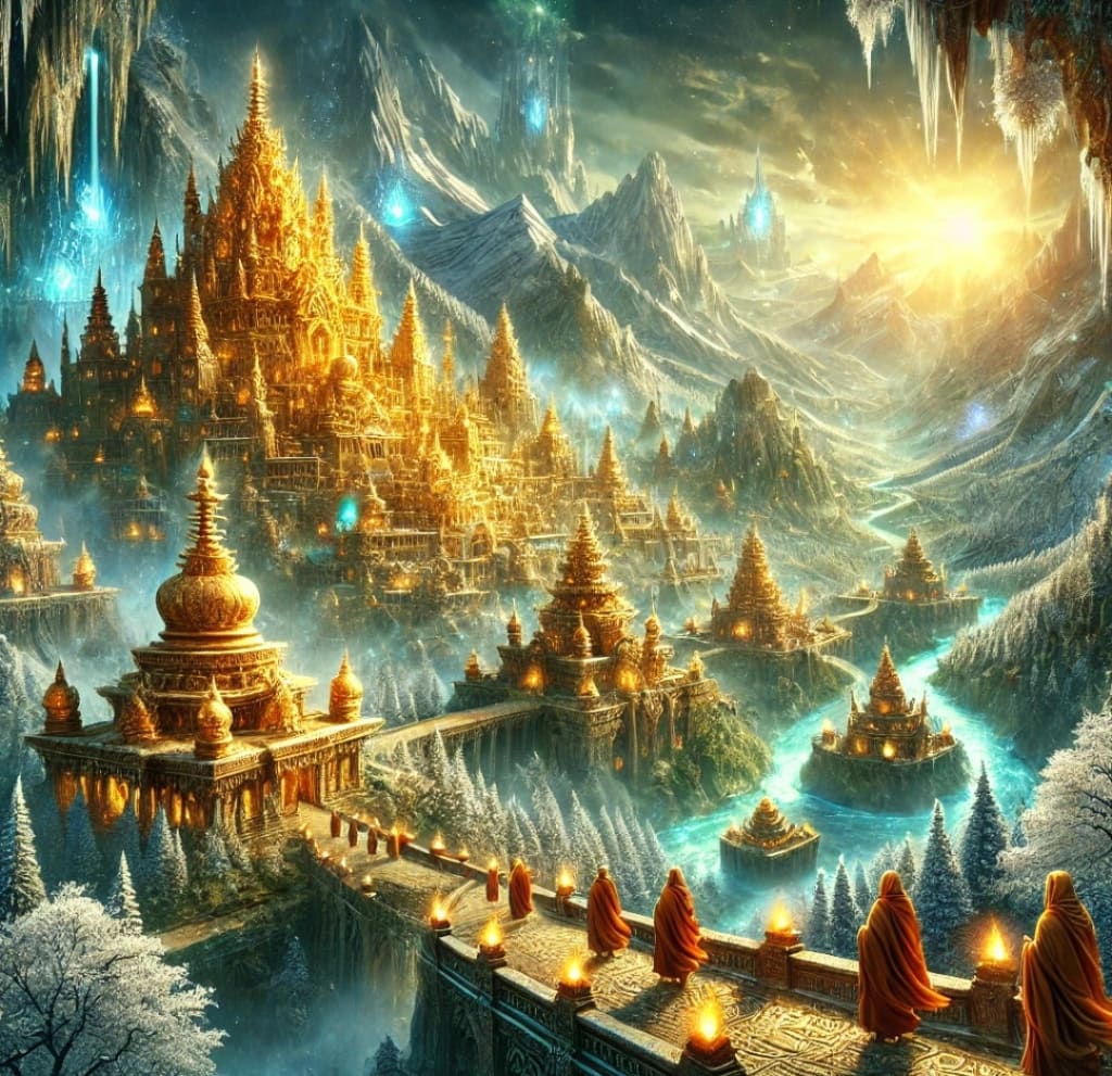 A breathtaking depiction of the legendary kingdom of Shambhala, said to be concealed deep within the Himalayan mountains. This mythical paradise is illustrated with golden temples, glowing crystals, and serene monks, capturing the mystique, tranquility, and ancient treasures associated with this lost utopia.