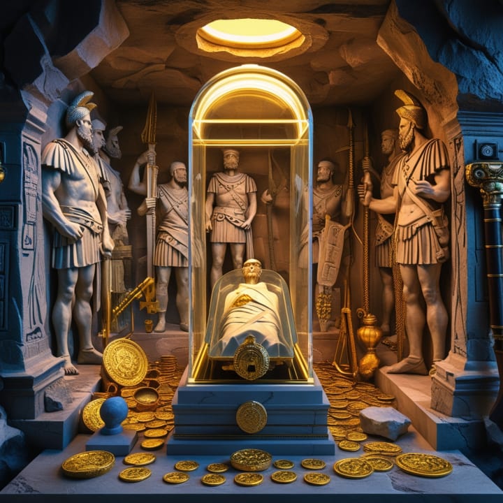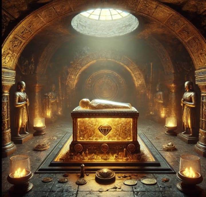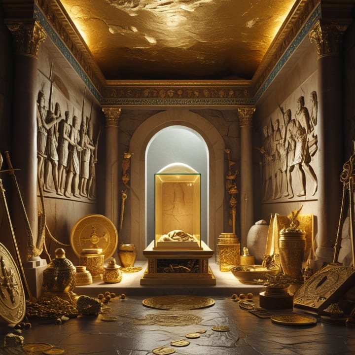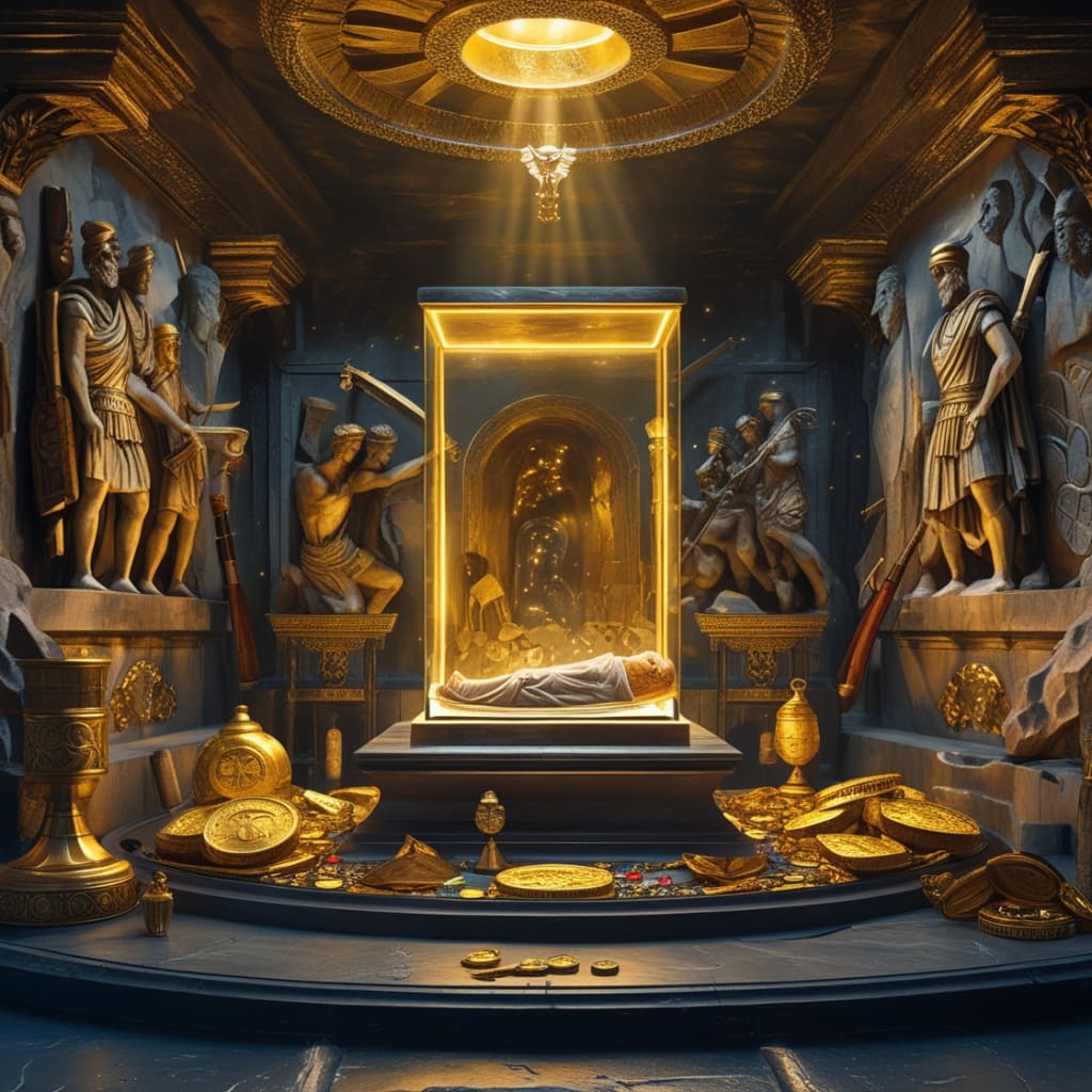 This depiction imagines the mythical hidden tomb of Alexander the Great as an opulent underground chamber glowing with golden light. At its center lies a glass sarcophagus surrounded by treasures, including gold coins, jewel-encrusted artifacts, and weapons. Intricate carvings on the walls narrate the conquests of the legendary ruler. The artwork captures the grandeur and mystery of one of history's most enduring enigmas.
