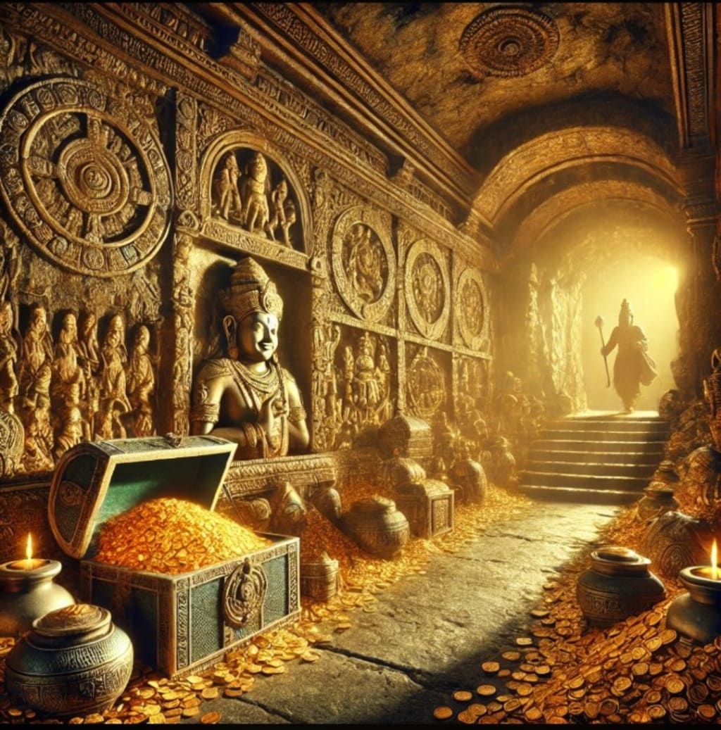 The illustration portrays the legendary hidden treasure of Krishna Deva Raya, the revered ruler of the Vijayanagara Empire. The underground chamber, bathed in golden light, holds a vast array of gold coins, jewel-encrusted crowns, and intricate artifacts. The carvings on the walls narrate the grandeur and achievements of his reign, emphasizing the cultural and historical legacy that the treasure symbolizes. This scene captures the awe and mystery surrounding one of history’s most captivating tales of wealth and power.