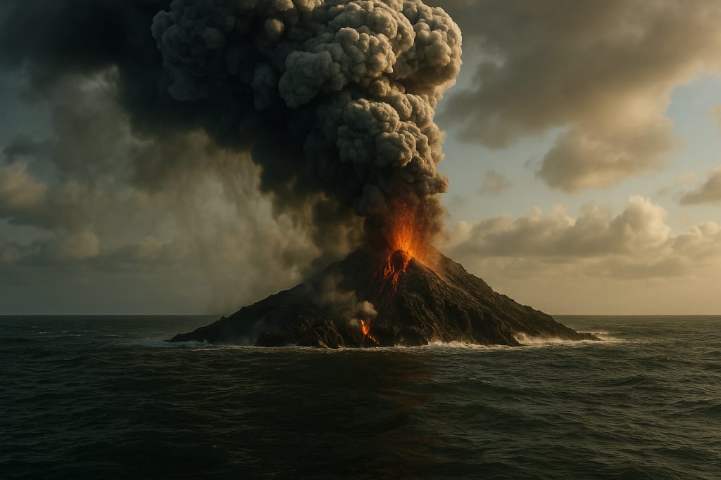 From the blistering blue depths, a column of fire and ash clawed into the heavens. Flames danced atop the waves like torches lit by the underworld. The water boiled. The air stank of brimstone. Out of the chaos, a new island rose—angry, steaming, alive.