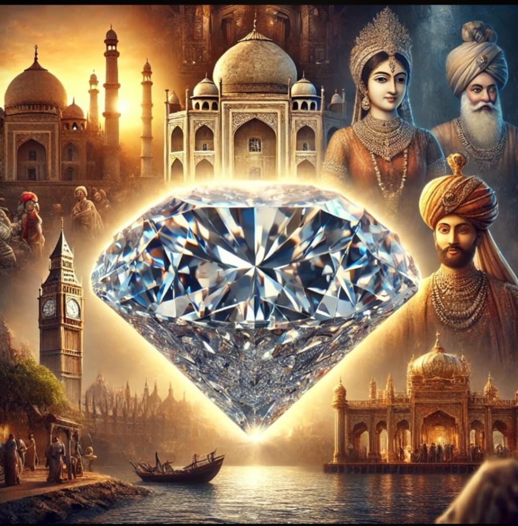 This illustration captures the legendary journey of the Kohinoor diamond, from its origin as a 793-carat uncut gem in ancient India to its current form of 105.6 carats in the British Crown Jewels. The glowing gem symbolizes its unparalleled brilliance, surrounded by scenes of historical importance, including Indian temples, the Mughal Peacock Throne, and the Tower of London. It reflects the diamond's tumultuous history of conquests, reductions, and cultural significance.