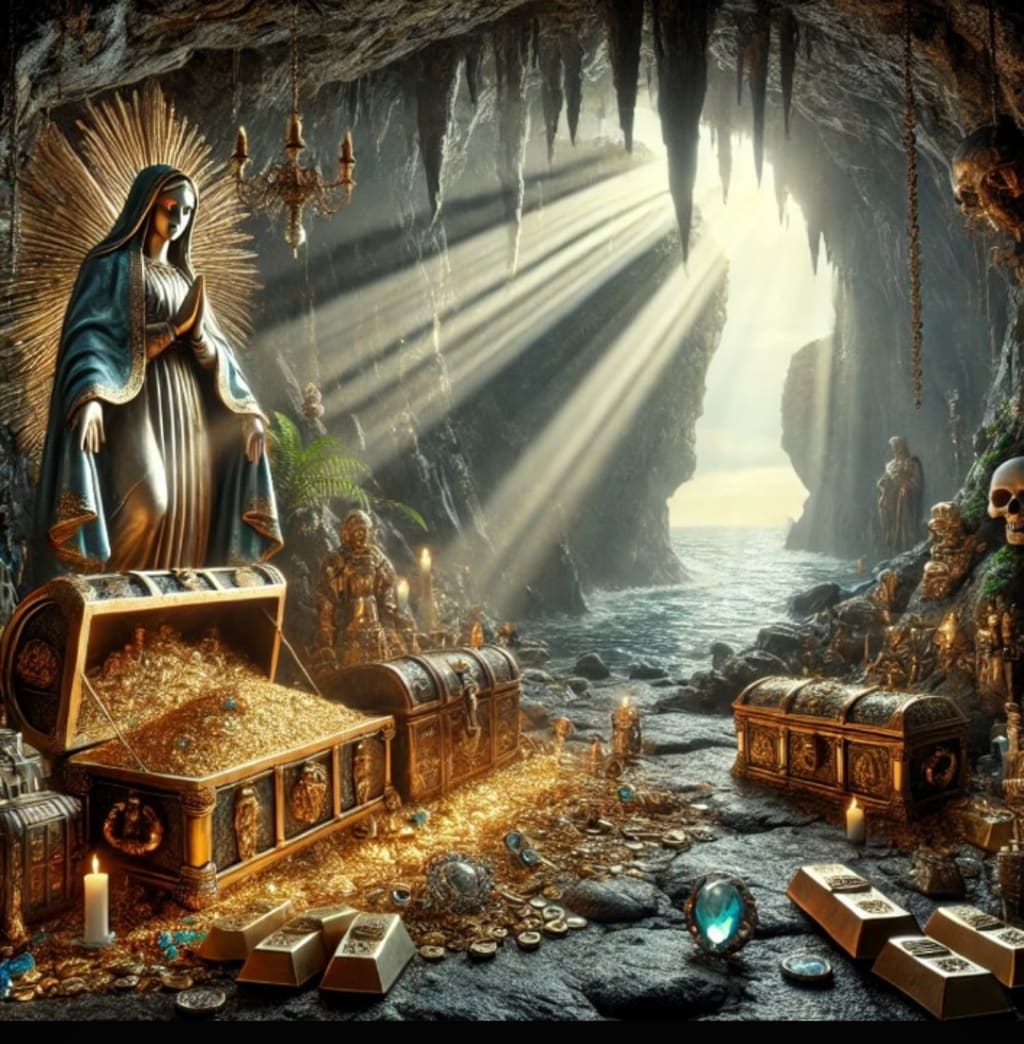 This illustration captures the legendary Treasure of Lima, hidden in a remote cave on a tropical island. The scene showcases a trove of golden artifacts, sparkling jewels, silver ingots, and a gem-encrusted Virgin Mary statue, illuminated by sunlight streaming through cracks in the cave. The image reflects the allure and mystery surrounding the treasure, a symbol of betrayal, adventure, and the enduring human quest for discovery.