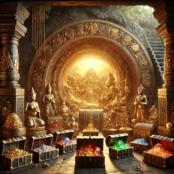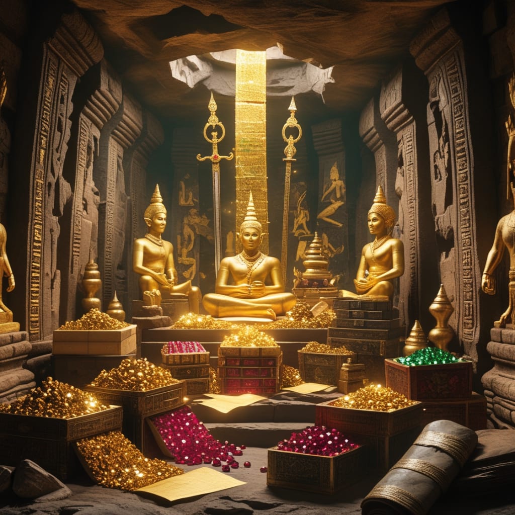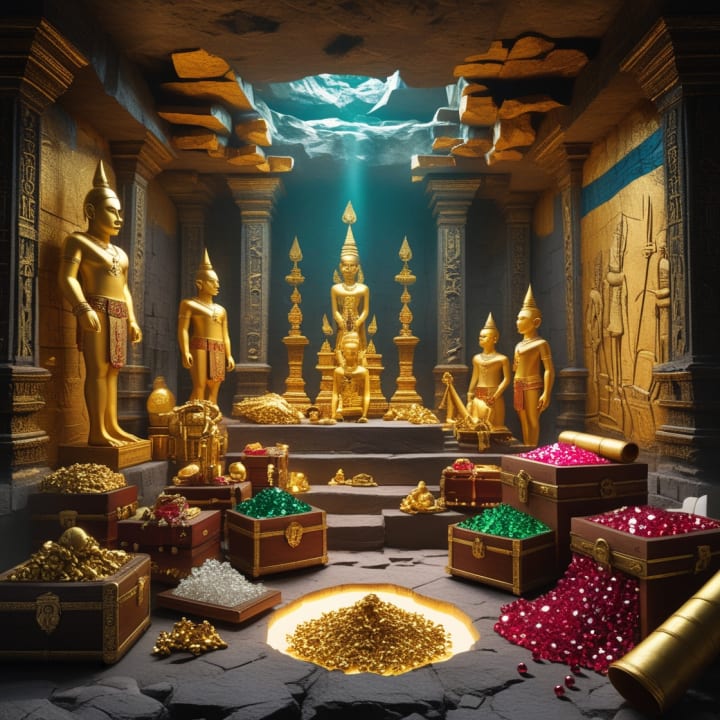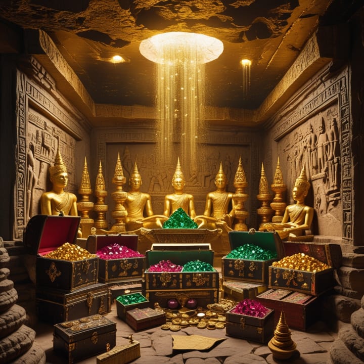 The story of the hidden treasure of Poomphuar unravels the mystery of a legendary Southeast Asian city that was once a flourishing hub of trade and culture. Deep beneath the ruins, explorers uncover a radiant underground chamber guarded by intricate carvings and ancient traps. Inside lies an opulent collection of gold statues, jewel-encrusted weapons, pearls, and ancient scrolls that tell the story of a forgotten civilization. The treasure symbolizes the wealth and artistry of the ancient city, shrouded in myths and secrets that captivate the imagination.