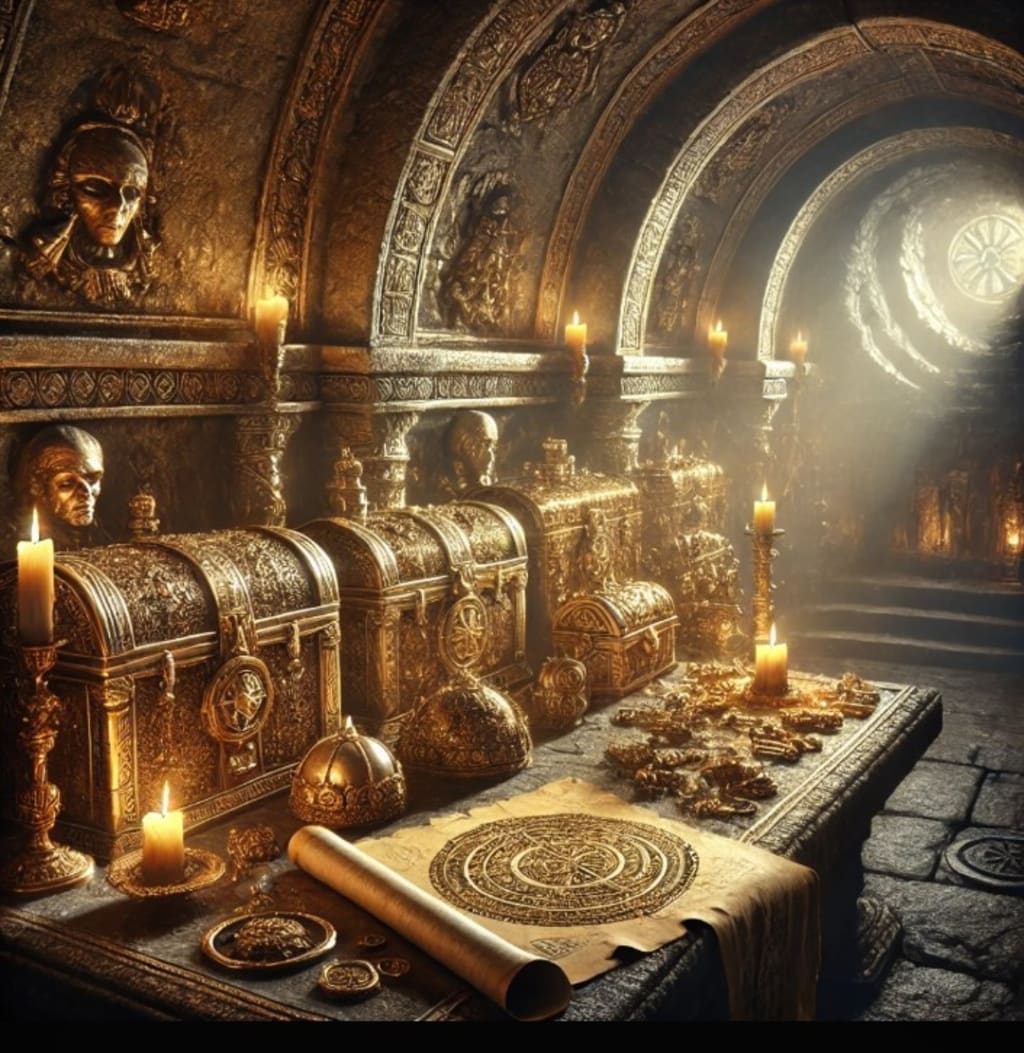 The Knights Templar, one of history’s most enigmatic and powerful organizations, amassed vast riches over centuries. Legends tell of their hidden treasure—gold, sacred relics, and ancient manuscripts—stored in a secret vault. This image captures the essence of that legend, depicting an underground chamber filled with priceless artifacts, illuminated by flickering torchlight. The scene evokes an aura of mystery and adventure, hinting at the possibility that the lost Templar fortune may still be waiting to be discovered.