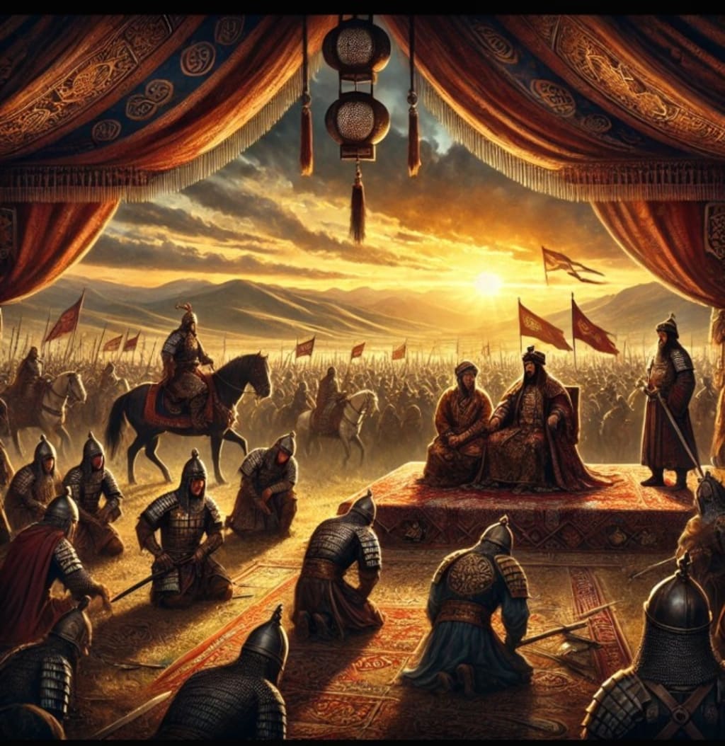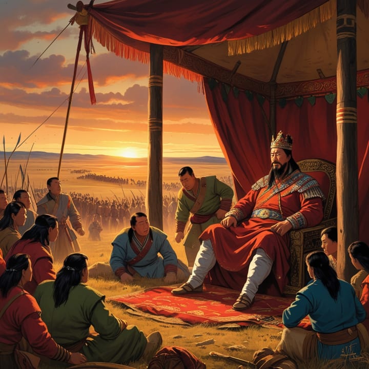 Genghis Khan, one of history’s greatest conquerors, met his end in 1227 under mysterious circumstances. While some sources claim he died from injuries sustained in battle, others suggest illness, an assassination plot, or even a hunting accident. His death remains shrouded in secrecy, with his tomb never discovered, adding to the legend of his final moments. The image captures this enigmatic event, set against the backdrop of the Mongolian steppe, as his loyal generals gather in grief and uncertainty.