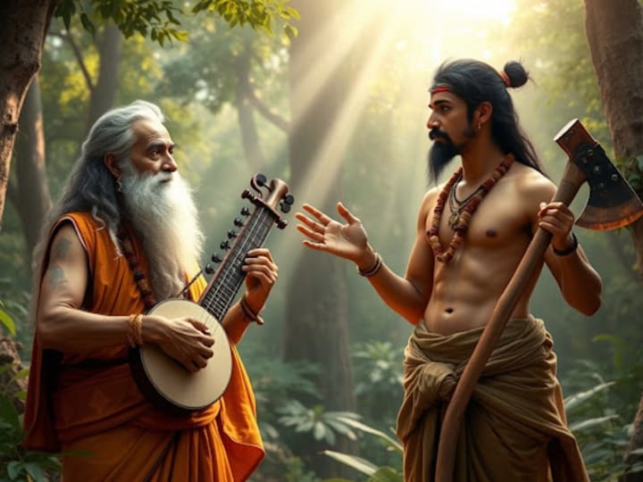 One fateful day, Ratnakar hid behind thick bushes along a forest trail, waiting for his next victim. Suddenly, he spotted a lone traveler approaching-a sage clad in saffron robes, chanting softly, “Narayana, Narayana.” Unaware that this was no ordinary man but the divine sage Narada Muni, Ratnakar leapt out, brandishing his sword.