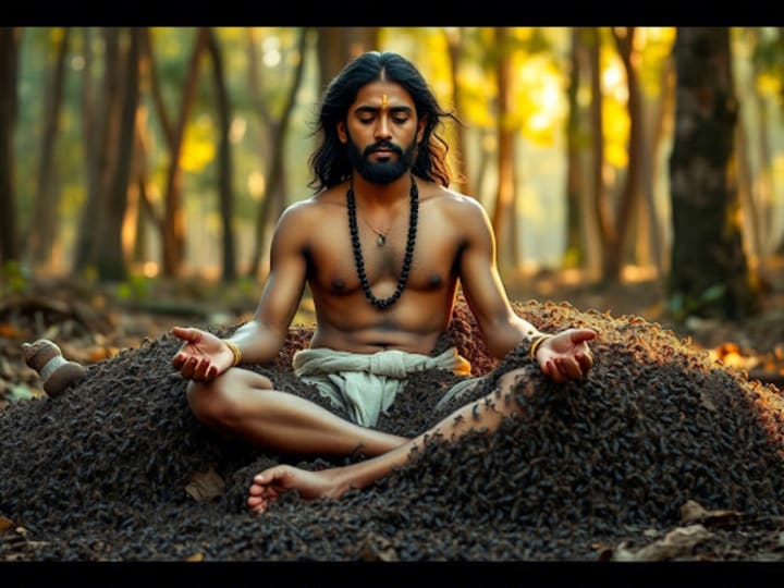 With newfound hope, Ratnakar retreated deep into the forest. He sat under a tree, closed his eyes, and chanted “Mara Mara” ceaselessly. Days turned into weeks, weeks into months, and months into years. So absorbed was he in his devotion that he stopped eating, drinking, or even noticing the world around him. Ants swarmed around him, building a mound over his motionless body.