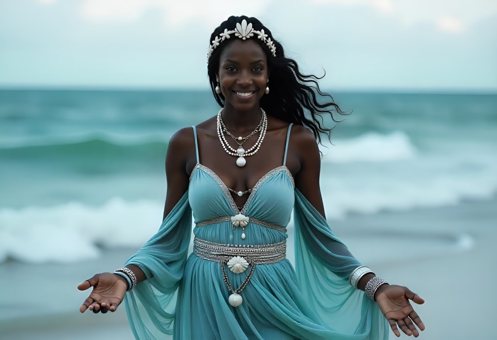 In Brazil, Yemanjá’s association transitioned from rivers to the ocean, reflecting her role as a mother figure who protects and provides for her followers. Many Brazilians, regardless of religious affiliation, regard Yemanjá as a symbol of hope and resilience, and she has become an enduring icon of the nation’s cultural and spiritual identity. Yemanjá is often depicted as a beautiful woman adorned in flowing blue and white robes, symbolizing the ocean's waves. Her symbols include seashells, mirrors, and combs, each representing aspects of femininity, introspection, and beauty. Known for her protective qualities, Yemanjá is seen as a compassionate mother who helps those facing emotional turmoil, especially individuals navigating difficult relationships or personal challenges.