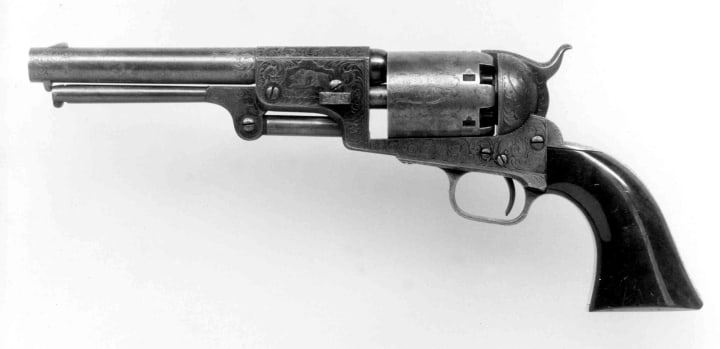 A blur. A click. A deafening and concussive boom. A small hole in the cheek of the once vomiting drunk. A spattering of blood and brain borne of a gaping hole in the back of his cranium. Bone fragments splayed onto the floor and drilled into the wall behind him. The wide eyed gape of shock in his eye. Tar dribbling from his lips. His body seemingly sinking into the floor, its breath emptying with the rest of its' excrement. A puddle of piss, shit, vomit, and blood pooling underneath. A stillness. A ringing in Ol’ Gils ears. Ol’ Gils jaw dropped. A long barreled army issue dragoon pistol pointing stiff at Ol’ Gil. An empty existential stare on the face of the scalper. The slow crane of a terrified barkeeps head realizing he’s under barrel. Utter shock. A thought of palming the two-shooter in his sleeve. An interruption.