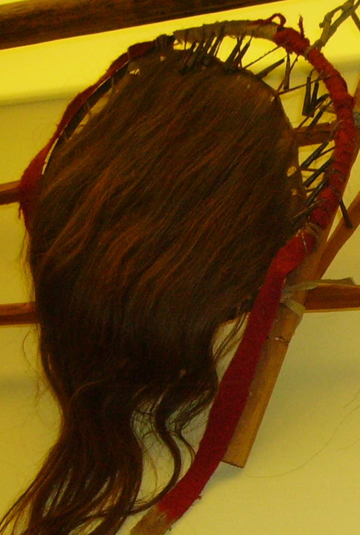 Its ears still attached, as to retain full value, this horror was a human scalp soaked in the mass of blood and fat that made up the entirety of this deathly patrons crimson drenched parcel.