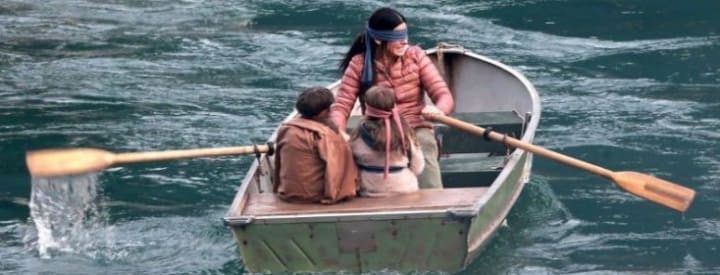 But it’s not just the acting of Sandra Bullock why this film entered my list “best movies of 2018.” The film itself impressed me. It’s that constant feeling of threat, helplessness, and fear that you get while watching this film. Inevitably one will compare Bird Box with A Quiet Place. In this film, the survivors had to produce as little noise as possible, because those who have conquered our beloved globe have a pair of sophisticated ears. Every sigh or groan can, therefore, be heard by them over kilometers, with the result that the person who produced the sound can’t do this a second time. In Bird Box, looking is already fatal. That’s why a lot is being blinded with newspapers, curtains, and blindfolds. An advantage for the pregnant among the survivors. No problem to be noisy while giving birth.