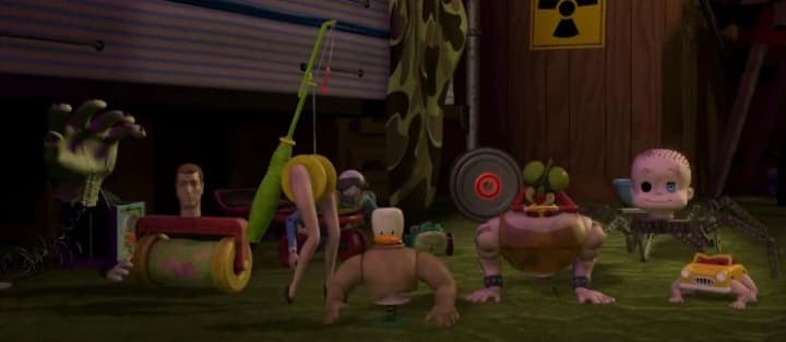 When Woody finds out Sid has taken Buzz and has him tied to a rocket ready to blast him, he quickly gathers the Mutant Toys together, and they all go and hide in the sandpit in Sid's garden ready to scare him. As Sid is ready to prepare Buzz, Woody and the Mutant Toys come to life, turn all creepy and scare Sid into not harming any toys again, he is petrified by this, so he drops Woody and runs off screaming like a little girl, a victory for the gang. It comes across like Annabelle/Chucky in this scene.