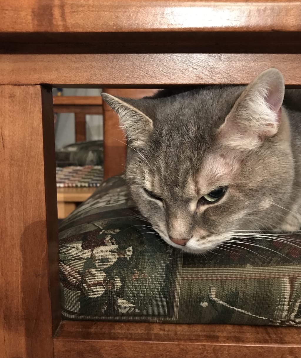 Walking towards the table, she noticed at its base, under the quilt, something barely moving, a peculiar rectangular shape, nearly indiscernible. At closer inspection, it appeared to be an ancient, emaciated calico cat, mostly dirty white, with matted fur. It was trying to swallow a small dime-sized piece of red fabric. Some klutz in Oxfords had probably stepped on the edge of the quilt, ripping it.