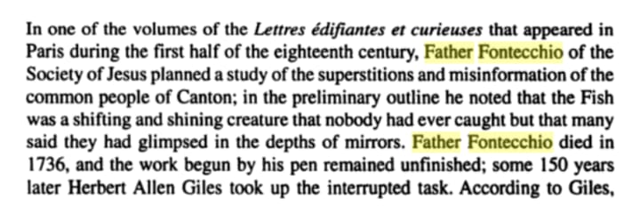 I found copies of the complete works of Herbert Allen Giles, digitized and searchable, and there's no mention of Fontecchio, Zallinger, or anything having to do with creatures from mirrors. Giles does briefly mention the Yellow Emperor, but there's nothing I can find that connects his writings to any of this. I also found two archives with copies "Lettres édifiantes et curieuses" available. I brushed up on my French and pored over them, looking for any indication anywhere relating to the Borges myth of the Yellow Emperor. Sadly, I didn't find anything. I'm also not the only person looking. Folklorist Daniel Peretti, who works at the Memorial University of Newfoundland, seems to have taken on the challenge in his own time and discovered at least some of Borges's sources in The Book of Imaginary Beings are genuine. I'll keep digging, but I don't expect to find anything. If I do, I'll certainly report back.