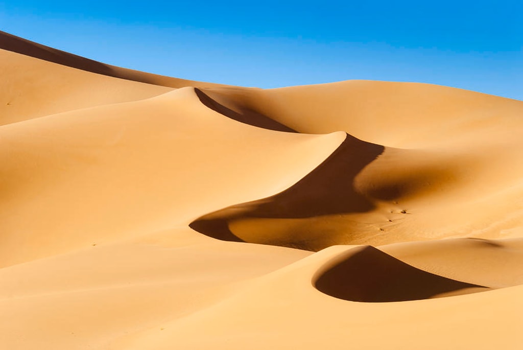 In desperation he quickened his pace to the top of the dune using both hands and feet to climb. When he reached the top he collapsed, closing his eyes and laying his head across the thin peak of the dune, panting and shivering still. When he opened his eyes, his breath had stilled as he gazed out across an endless horizon of unbroken sand, rising and falling and rising and falling again.
