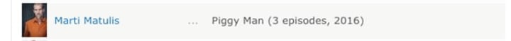 Appearing as The Sandman in Season 1 of Sleepy Hollow, Marti Matulis actually looks like the most sensible answer — after all, he is the actor credited. All those hoping for Peters the Pig should probably pack up now. The 46-year old actor is known for playing non-human entities, also appearing in the likes of Grimm and Star Trek: Nemesis. Notice that rather familiar little bump on his shoulder. Matulis's physique matches the slender and toned body of Piggy Man, so this could be an open and shut case!