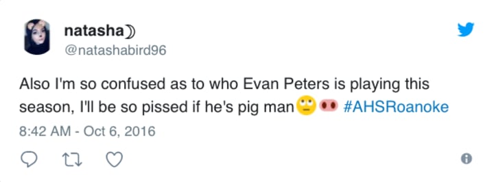 As one of American Horror Story's biggest stars, and a series regular, you would expect quite a lot of screen time if you were Evan. One of the originals, Peters has had a huge presence since the show started in 2011, so we are right to ask where he is. Pulling the pork over our eyes is one way to ensure chatter around the show (not that it needs it). Evan has refused to confirm or deny any allegations, remaining tight-lipped on his whereabouts this season. Turning to Twitter, @ahsnews_feed noticed a similar shoulder bump between our porky perpetrator and Peters: