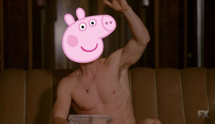 To get things started, I would like to point out that it is Marti Matulis who is actually credited as "Piggy Man" on IMDb. However, in a world of dual roles, a "pig reveal" could easily be in the cards. Also note that the credits have included both Evan Peters and Cheyenne Jackson's names every episode without them actually appearing on screen; we are now 99% sure that Jackson is the voice of the man behind the camera in the "real life" interviews, so let's round up the theories on who could be the man behind the meat!