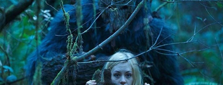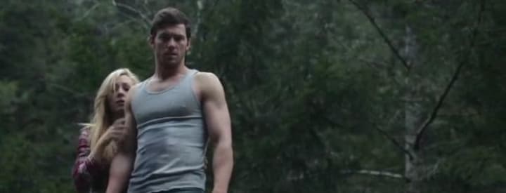 They have incorporated the legend of Bigfoot in this film. A Bigfoot with a fashion statement. The mysterious creature uses tree bark as a disguise and protection. You don’t have to wait long to see the creature in action. After Ashley (Casey Gagliardi) has picked up her other half, Max (Andrew Joseph Montgomery) at the prison gate, and takes a short pause on the way home to let mother nature take her course (a year of celibate life has its consequences), they accidentally hit someone crossing the road. Well, calling the authorities is problematic, since Max just left prison. The crumpled body also looks badly pulped. You could say that a steamroller ran over him, instead of a typical SUV. And then someone also starts throwing huge boulders at them. While the unfortunate Max falls down into the river, and Ashley jumps after him as brave savior, they don’t realize that the bad guy who’s responsible for this, is our friend the-giant-forest-monkey-who-could-be-used-as-a-wall-to-wall-carpet.