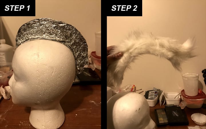 - Next came the Mohawk. Again, using some tinfoil I shaped the form of what I wanted my Mohawk to be. I used a styrofoam head form with the similar head shape as me so it would have a nice fit to my own head. Using the same white faux fur fabric (this time keeping the fabric backing attached) I cut pieces out and shaped them up onto the tinfoil form with hot glue. Once that was finished I gave it a nice pink rock-star stripe.