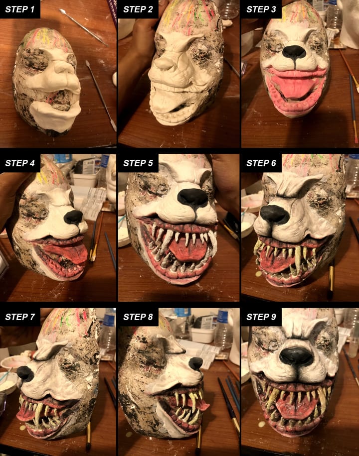 - Last but not least, there was Roxi’s mean muzzle of a were wolf nose and mouth. For this I actually wanted the bottom jaw to move freely so it looked like it was a natural movement when opening and closing my mouth. First, I used my own plaster face cast form so I would have my exact face measurements. Using modelit lightweight air dry clay I shaped out and carved the bottom jaw piece, the upper mouth piece, the tongue, the nose and the brow. I let that air. Before the face piece was completely dried down, I made tin foil werewolf teeth and coated each individual one with liquid latex and let dry (again to make it easier to paint over). I place the teeth were I wanted them to lay in the gums of the mouth. Once the face piece and teeth were completely dry, I began the painting using a mixture of water activated body paint and acrylic paint. To hold the teeth in place I hot glued them within each designated gum hole. For the final touch to make the nose, lips, and gums look like they were wet, I put a coat of clear nail polish. It gave it a nice lifelike touch!
