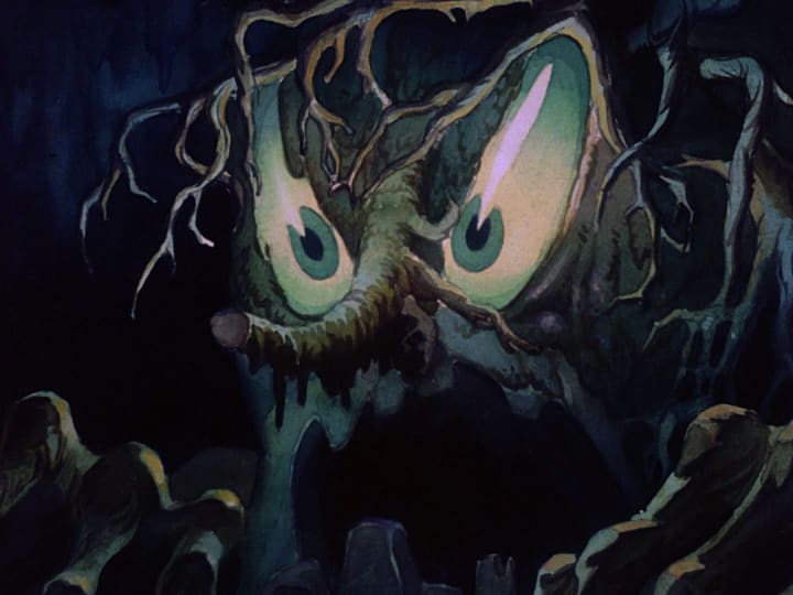 The Queen learns that Snow White lives in the Dwarfs cottage in the forest so turns herself into an old peddler woman. She creates herself a potion and things turn nasty quickly. The music turns quick, eccentric and psycho like making the Queen look mad. The image of her youngself turning grey isn’t a great sight to see, then the camera zooms into the old hag she turns into, even the crow finds the sight of her repulsive.Not a film you would want to watch before going to bed. Brad Bird an animator and director said during a Q&A session about Walt Disney’s work said “In fact [after about a month] they had to re-upholster the seats in a very large movie palace in New York because little kids were peeing on the seats when the witch came on in Snow White.” That pretty much sums up the Queen as a character. One of the scariest villains Walt Disney has created.