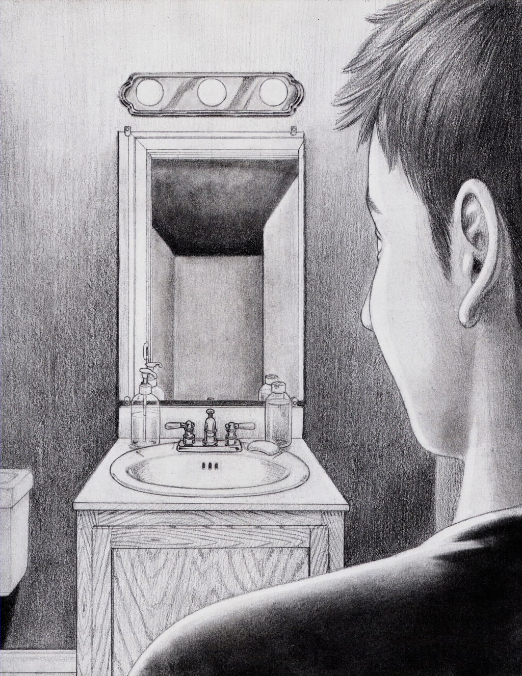 Slowly I looked up toward the mirror. My stomach dropped as my breath caught in my throat. Everything in the mirror was as it should be. My hair stood on end. Something was terribly wrong.