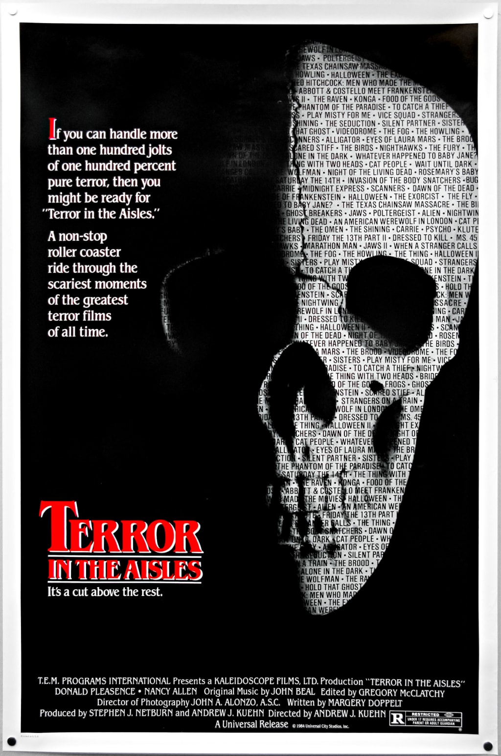 Terror in the Aisles is a 1984 anthology film starring Donald Pleasance and Nancy Allen narrating a bunch (and I mean a bunch) of horror movie clips from the Seventies and Eighties. or, mostly so. There's a wrap-around segment of them in a theater with a curiously multicultural bunch of moviegoers who are portrayed, weirdly enough, as obnoxious and unlikable. (What were the producers trying to say there?)