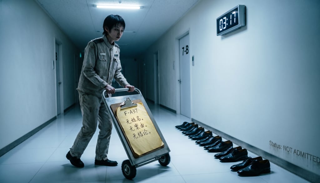 In the dim pre-dawn of the House of Light, intake officer Kobayashi wheels his cart into Room 7-B. One line on the clipboard remains blank: F-A37. No name. No case. No resolution.