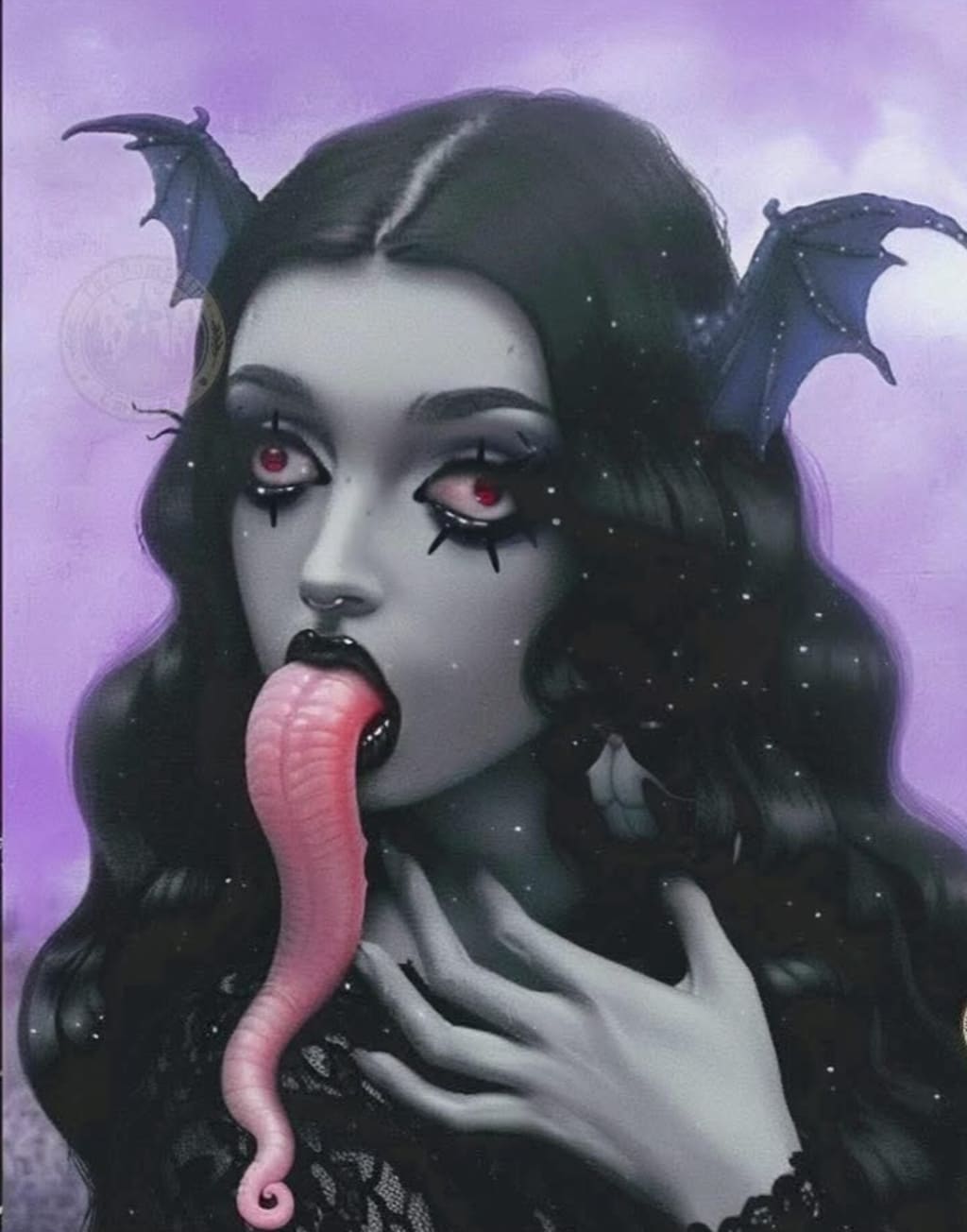 As she stepped inside, the air grew cold and thick with an unnatural fog. Suddenly, a haunting figure appeared, a woman with jet-black hair cascading over her shoulders, pale skin like moonlight, and eyes that shone with a wicked, crimson glow. Bat wings stretched from her head like dark crowns, and her tongue, long and serpentine, flicked out as she licked her lips.