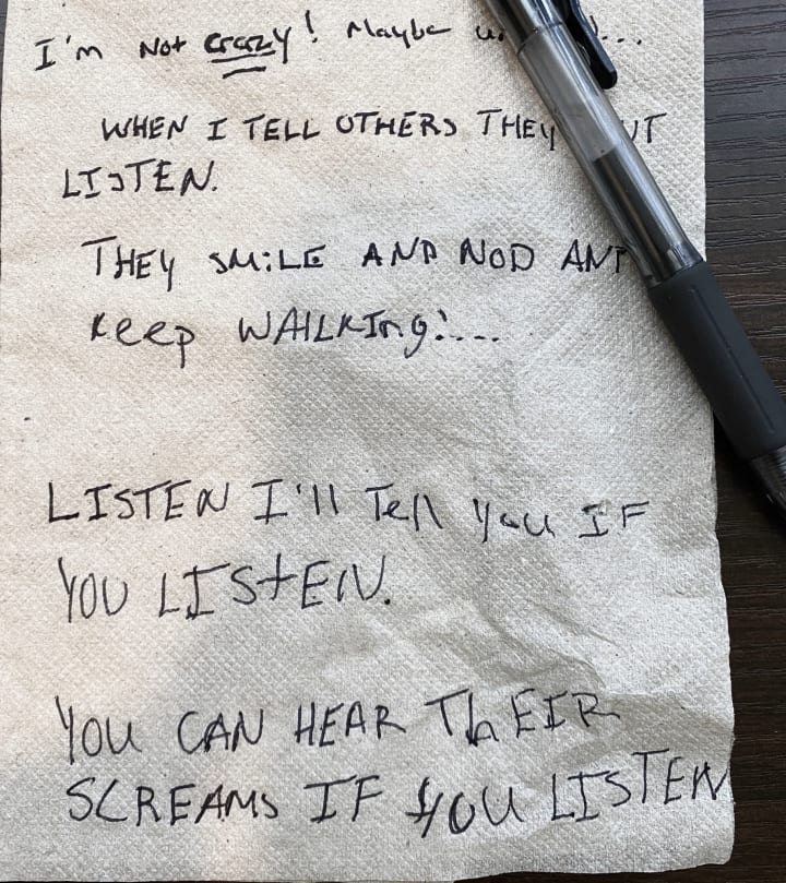I’m not crazy. I know I'm not crazy, maybe unhinged. When I tell others they don't even listen. They smile and nod and keep walking. My friends keep disappearing. I'm jotting this down on a napkin in Denny's to protect it. I'm scared every day. I know they're coming and I hear the hounds in my dreams. I don't eat anymore like the chefs. I need help. Listen...ill tell you if you listen. You can hear their screams if you listen. I'll tell you the whole thing. Before it's too late. He needs to be stopped,