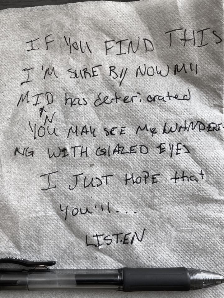 If you find this, I'm sure by now my mind has deteriorated. You may see me wandering with glazed empty eyes. I just hope that you’ll listen.