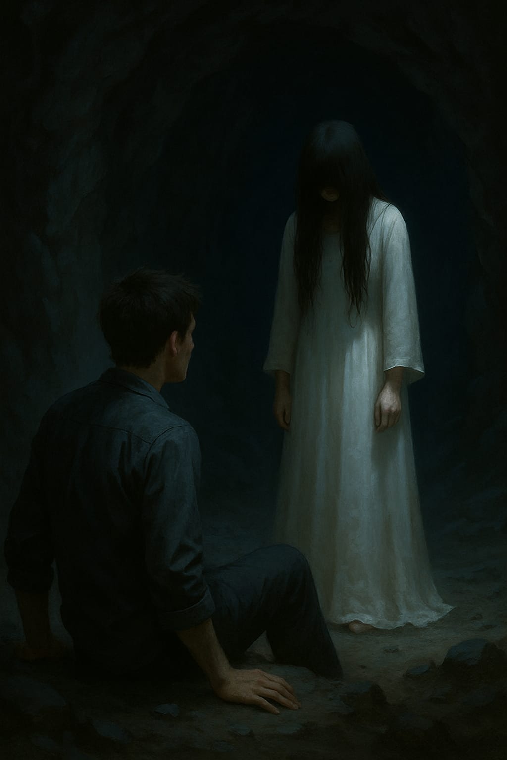 Standing just a few feet away was a woman—tall, with flowing black hair, a pale face, and eyes that seemed to glow faintly in the dark. Her expression was blank, unreadable. The fear in me exploded, and everything went black.