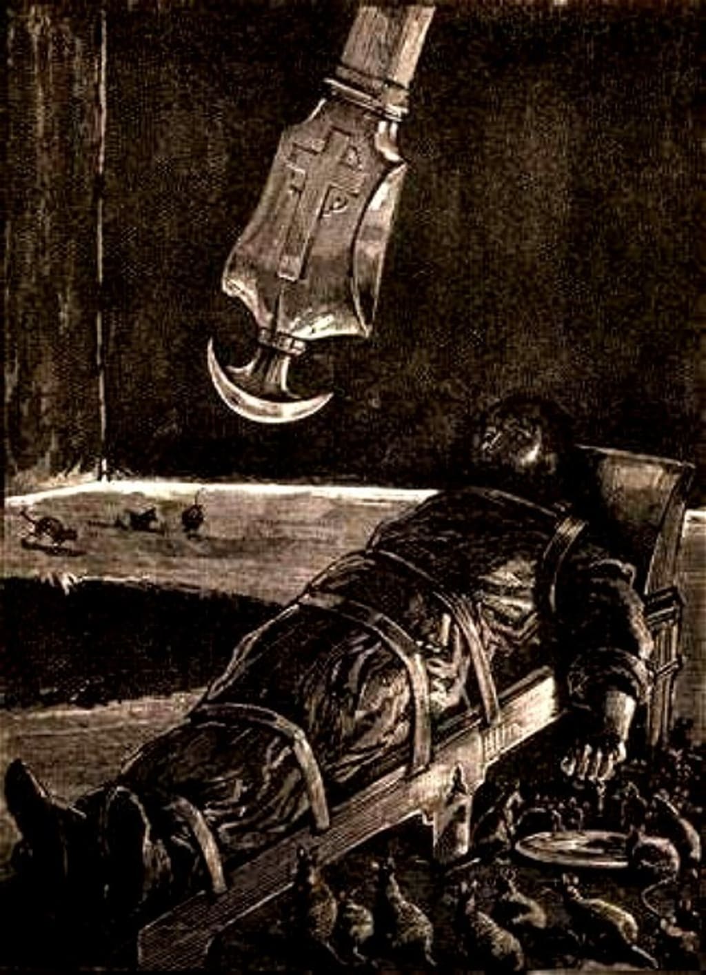 Strapped down, a saucer of nauseating, overly spiced food just out of reach, he rubs the bonds that tie him to the small bed. Rats emerge, chewing at the spiced food on his bonds, as, closer and closer the pendulum swings, threatening bisection and death. The rats, the outgrowth of his own deep, subconscious thoughts and desires, free him from his constraint. The vermin cowering in the dark, the buried, repressed, manic, and primitive feral urge to survive rendered into symbolic life, allows him to escape.