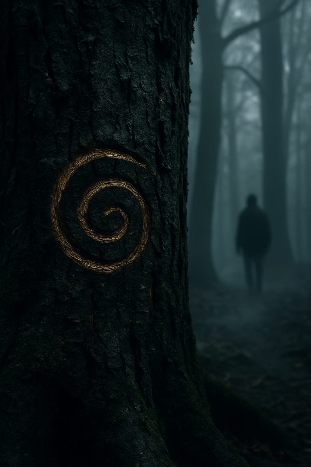 They found the first carving just past mile three. It was etched crudely into the bark of a blackened tree: a jagged spiral, with five lines slashing through it.