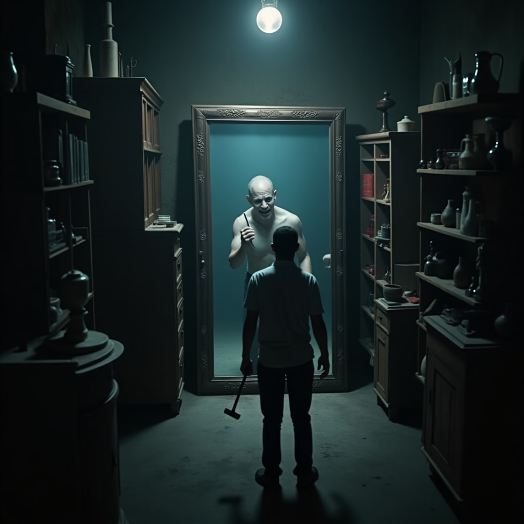 He decided to destroy it. Took a hammer to the shop, trembling with exhaustion and fear. He stepped in front of the mirror one last time, just to say goodbye to the nightmare.
