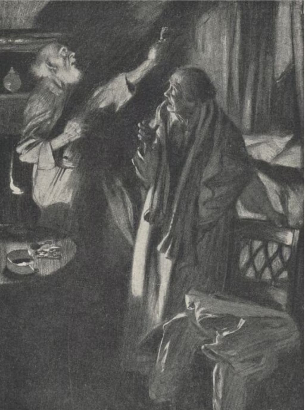 They sat down by the fire again while the two men finished their pipes. Outside, the wind was higher than ever, an the old man started nervously at the sound of a door banging upstairs. A silence unusual and depressing settled on all three, which lasted until the old couple rose to retire for the rest of the night.