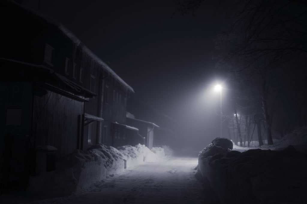 Just at that moment. He kicked something under the snow. He stopped, and moved it with his toe. It looked similar to his wife’s coupon wallet. Next to it was a dog leash and collar. “Must’ve been a big dog.” He had begun talking to himself shortly after starting his walk. He’d never done that before, but it made him feel better today. “Where’d you go buddy?” He looked around to see if a large dog suddenly materialized out of the darkness. He whistled and called out a couple of times, but no dog materialized from the dark.