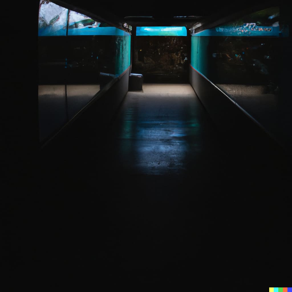 I kept hearing the noise coming from the other end of the main lobby. I saw in through one of the entrances to The Gulf of Mexico wing, and I swear I saw something. A mouth, perhaps? It looked like something was smiling at me, in the darkness behind the purple lights from the jellyfish tank. I don’t quite know if it was a mouth or not. It seemed too large or a normal-sized face. The grin appeared to extend well past the barriers of a normal face. I didn’t see anything else. I called out to see if anyone was there. Only the animals responded. Isn’t that funny? When I told them to stop talking, the mouth was gone. It was probably just all in my imagination. I do sometimes come up with some outrageous stories.