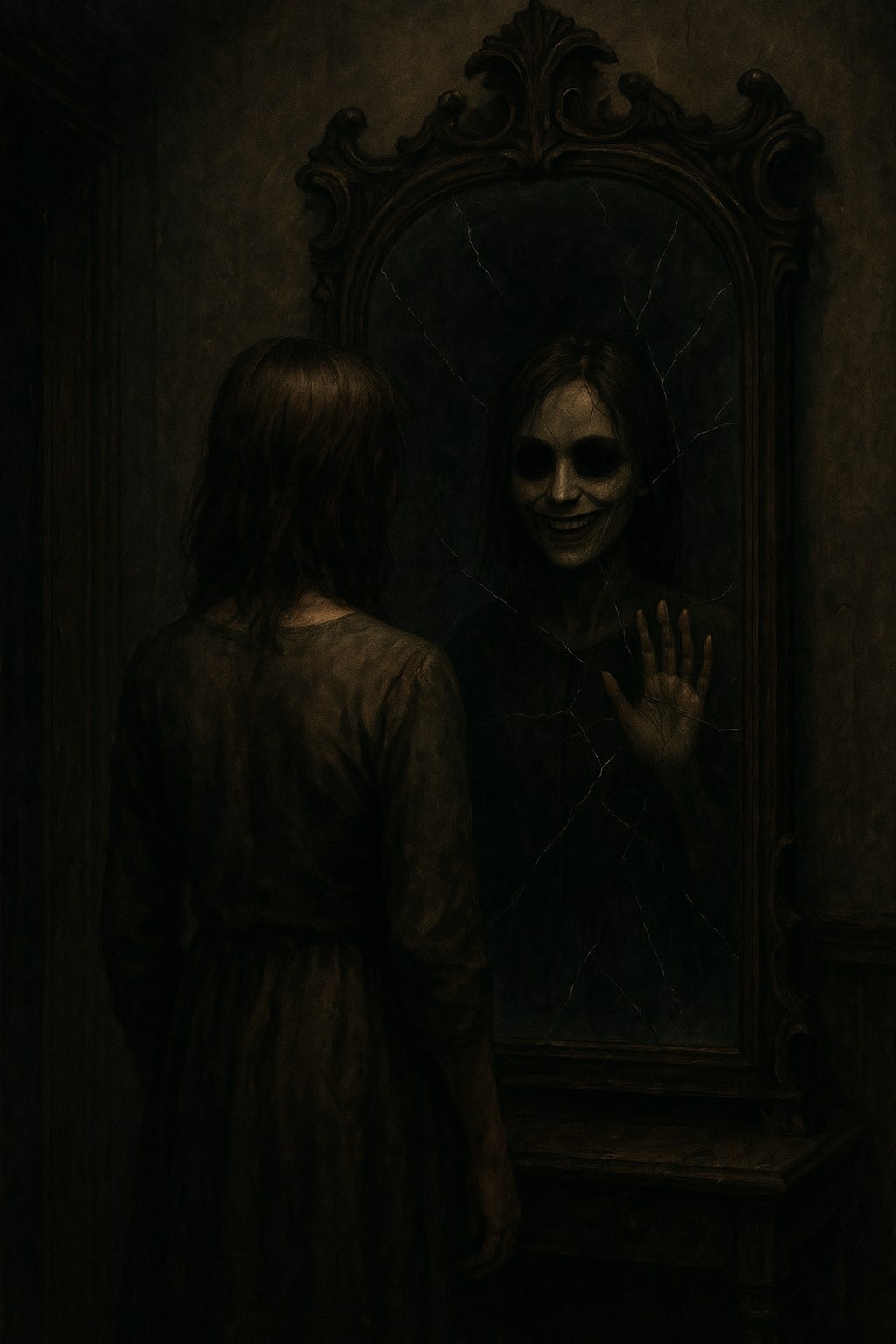 She woke up one night to the sound of footsteps. Gentle. damp. Taking a flashlight, she slipped down the steps. Something seemed to have breathed on the mirror from within, causing it to become foggy.