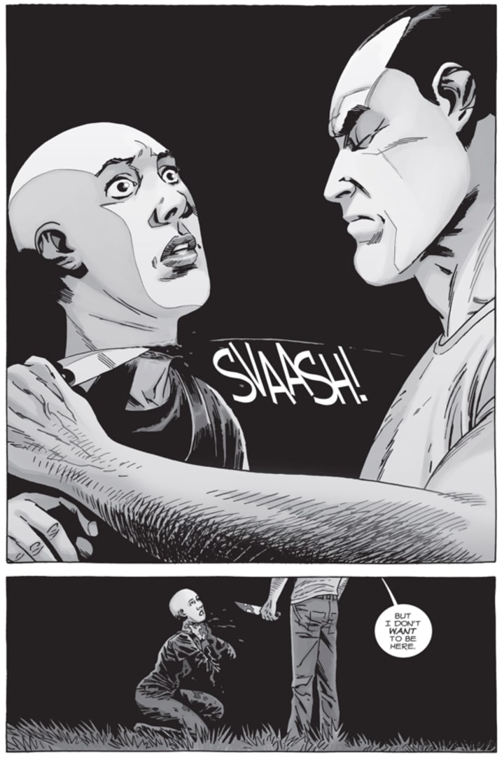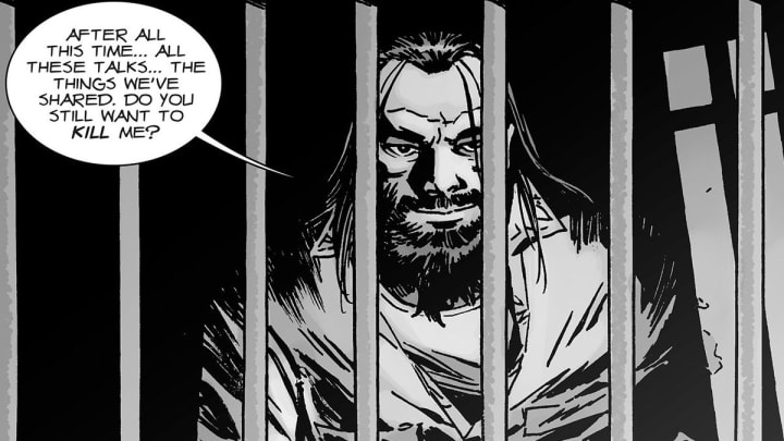 As in the comics, Negan is imprisoned following the conclusion of the 'All Out War' arc. The biggest differences between the comic and show at this point is that the initial time jump following 'All Out War' is much shorter, and Maggie does not agree with the decision to let Negan live. Shortly before Rick's disappearance, Maggie comes to Alexandria intending to kill Negan, but in a twist on the comic storyline, realises he will suffer more being imprisoned for life.