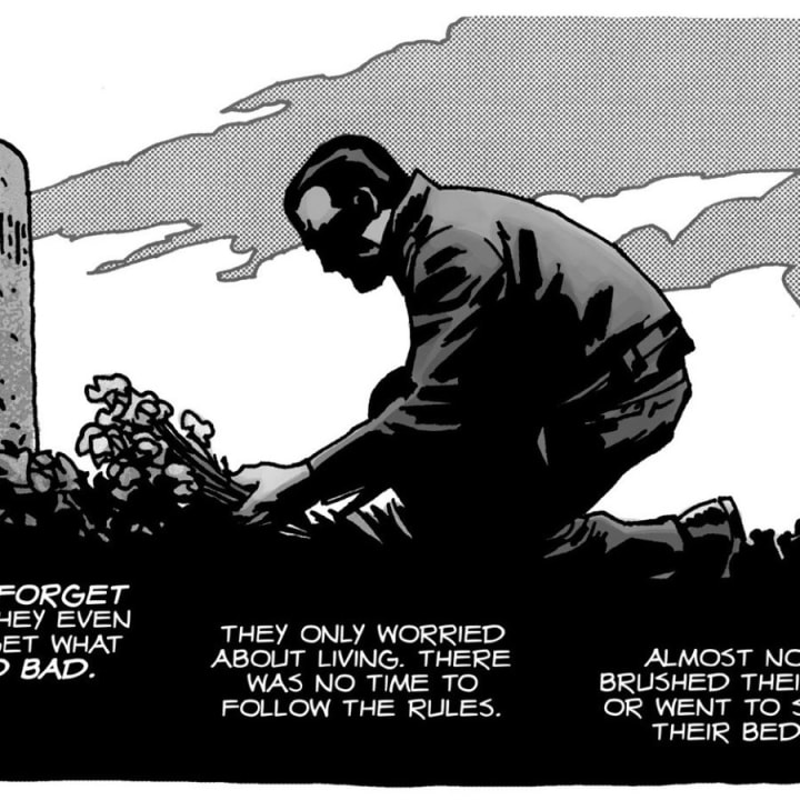Negan is absent for the entirety of the comic's 'Commonwealth Arc', and the one-shot comic 'Negan Lives!', set sometime before the final issue of the main The Walking Dead comic, reveals where he'd been. A young woman, Lucy, stumbles upon Negan's small camp. She reminds him of Lucille, and they chat a while, before Negan grows suspicious of Lucy's interest in him, moments before Lucy's travelling companions, Derrick and Barry, attack. Lucy tries to talk them out of killing Negan, but her pleas fall on deaf ears, and the men force Negan to begin digging his own grave, in the same spot he buried Lucille. The group is ambushed by Walkers, and Barry is quickly swarmed and devoured, while Negan beats Derrick to death with a shovel. He then invites a horrified Lucy on his new quest: To locate the real Lucille's remains and give her a proper burial.