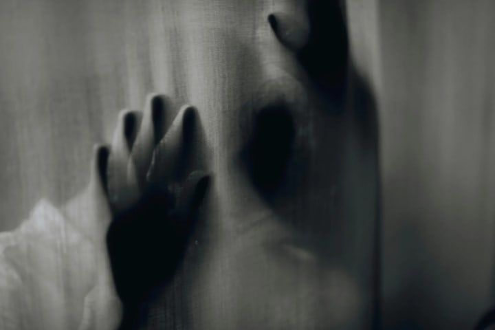 Blurred hands pressed against a curtain creating an eerie silhouette. [