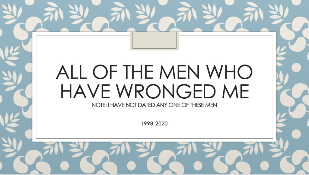 I had the idea to do this after my friends and I decided to make PowerPoint presentations detailing our failed past relationships complete with pictures. While my friends presentations were notably sad, and some even said they cried making them, I genuinely could not stop laughing.