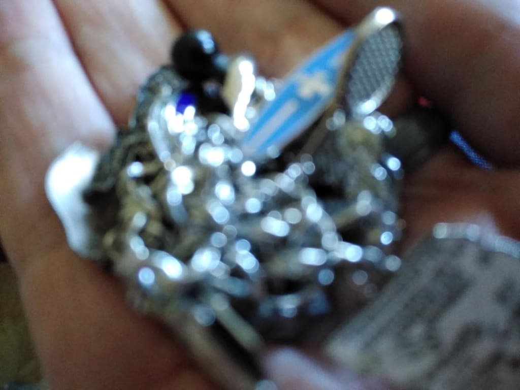 In a daze, needing something to cling to, I reached to the end table and I opened the smooth surfaced jewelry box. A silver charm bracelet with a matching necklace caught my eye and gave me pause. I had never seen my mother wear either piece. Perhaps they were too fancy for everyday wear or were simply keep-sakes of an earlier life. The tiny silver charms were memoirs of a life that I knew nothing about nor had ever cared to consider. A tiny dated graduation cap, a prancing horse, a train replica, tiny plates with names of places that I never knew were visited, listing awards that I never knew were earned. Symbols of a life my mother had lived before I was born.